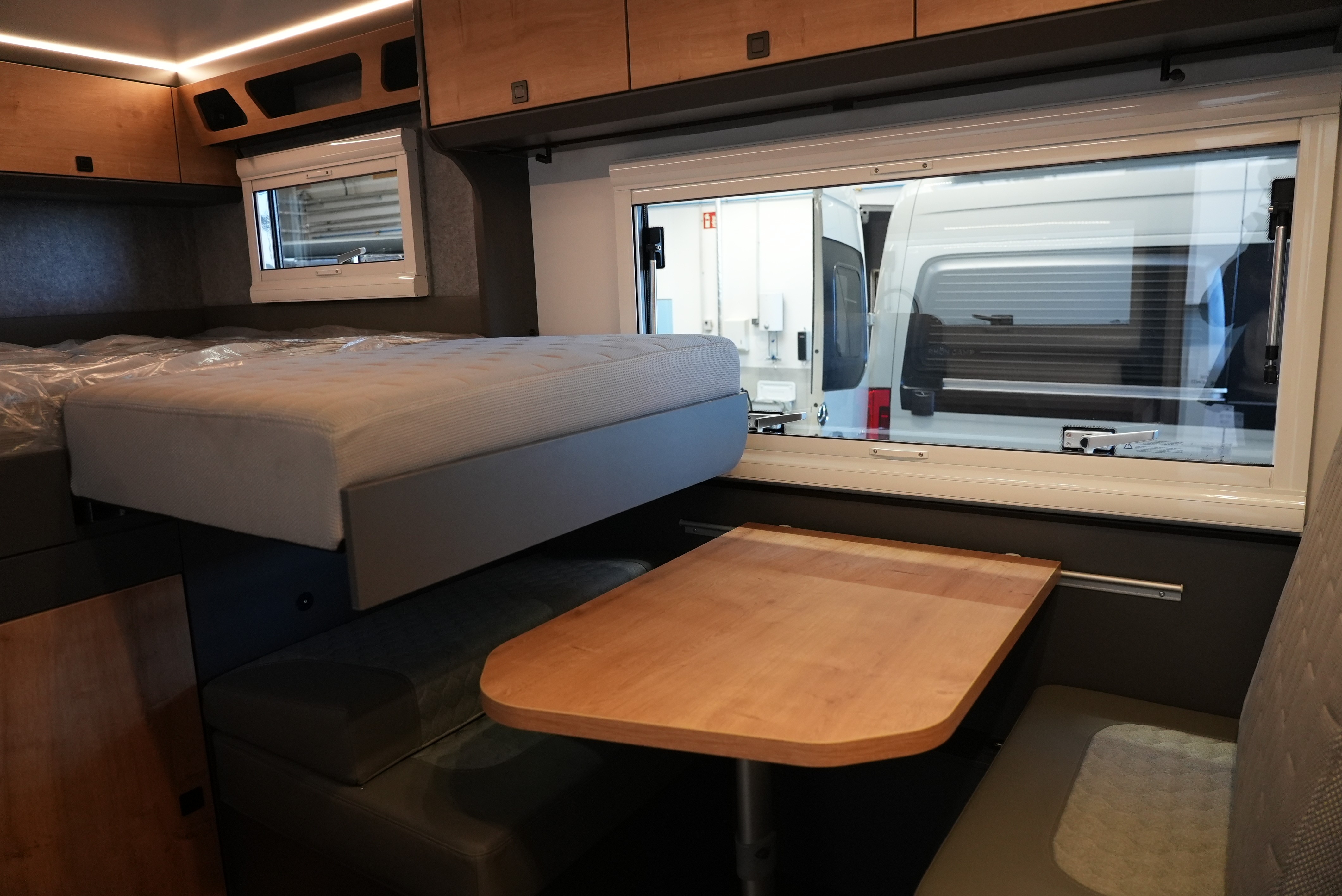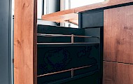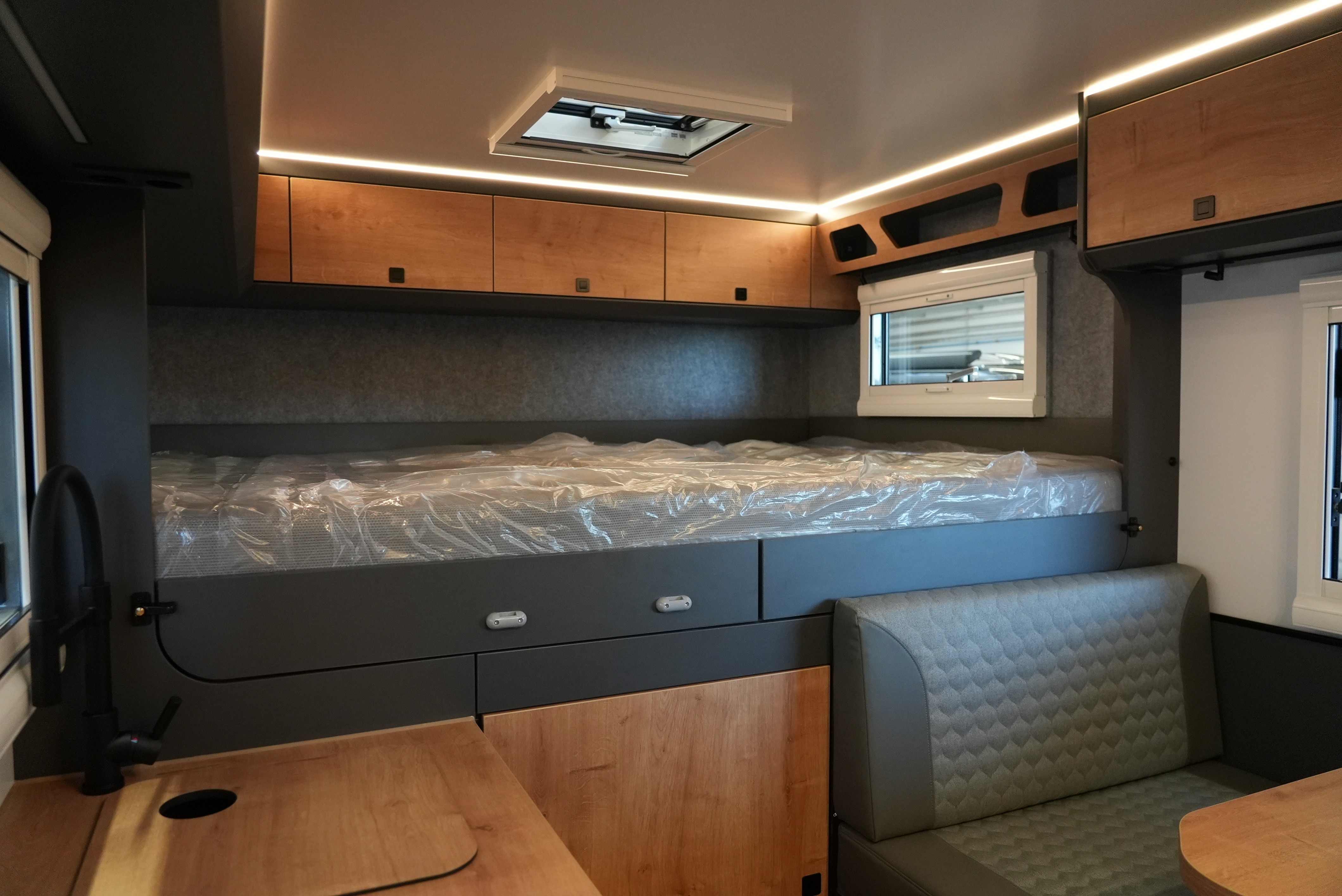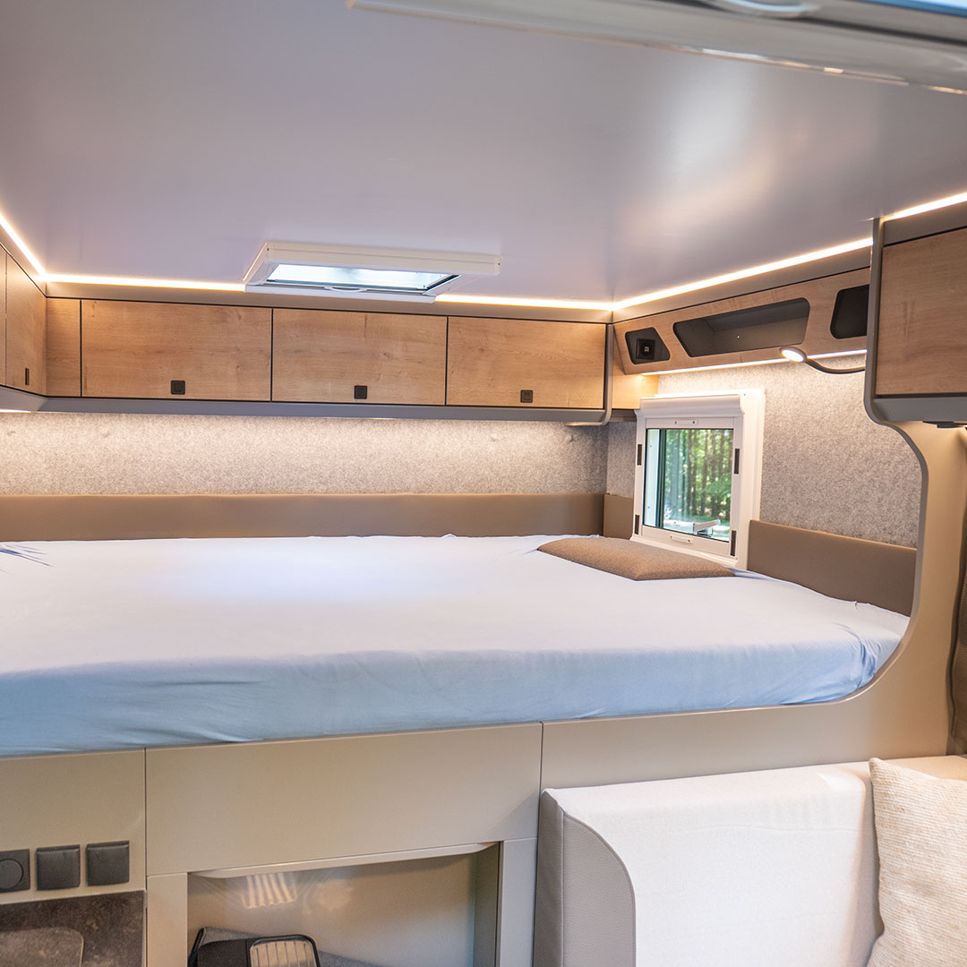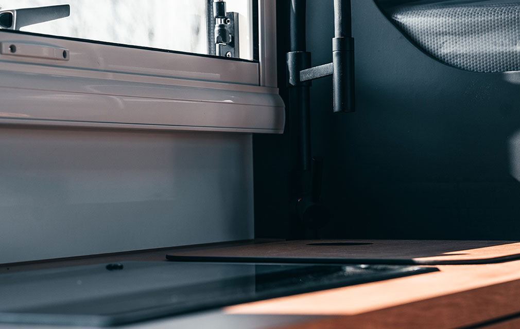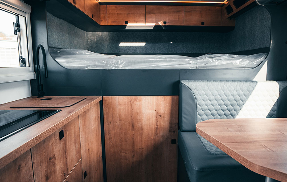 Der Rhön Camp Rebel 4×4 wurde auf Basis des Mercedes Sprinter entwickelt. Das offroadtaugliche Expeditionsmobil besticht mit seinem modernem sowie funktionalem Interieur – aus der eigenen Manufaktur.
