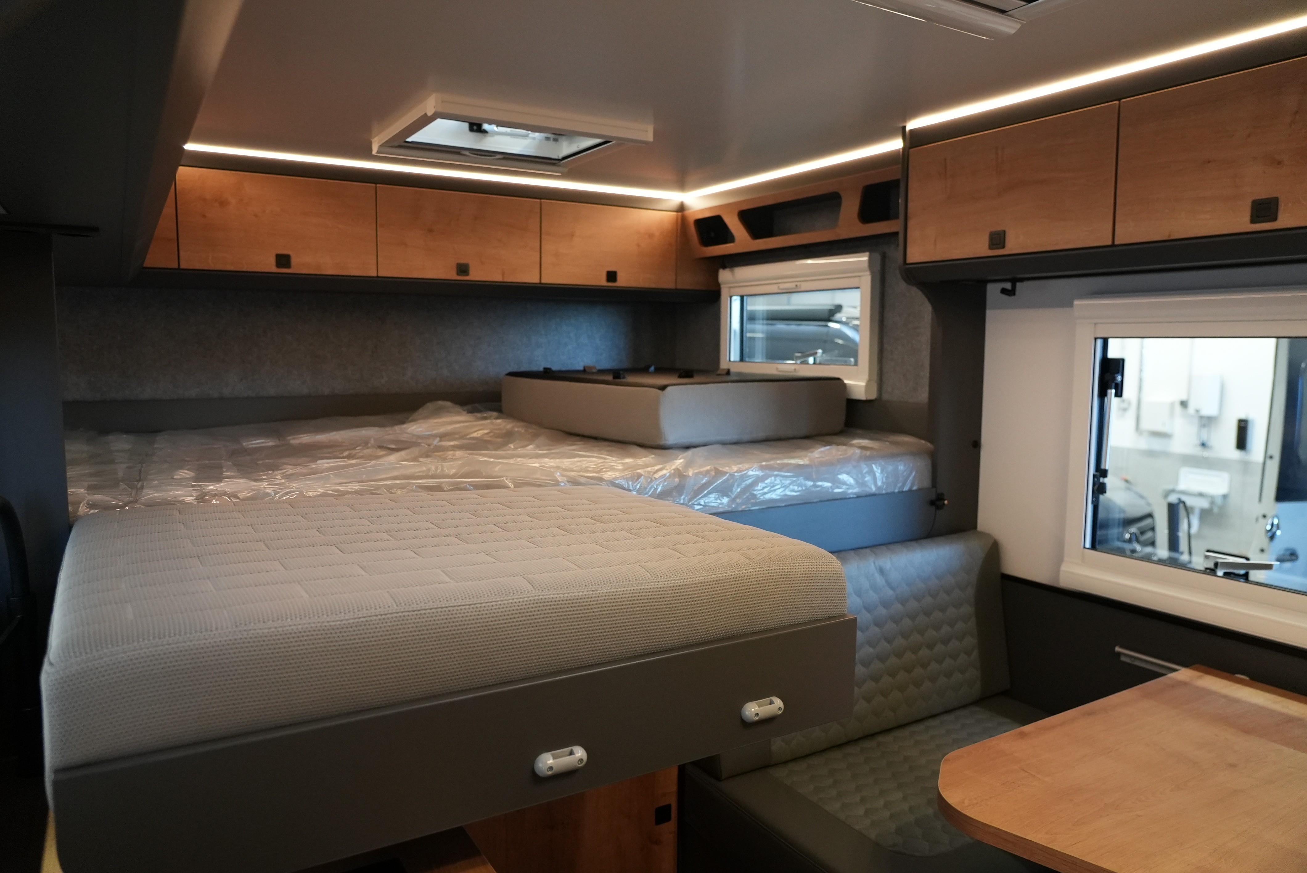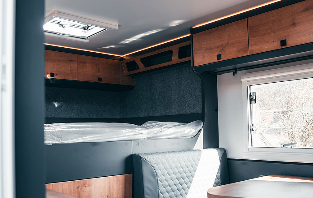 Der Rhön Camp Rebel 4×4 wurde auf Basis des Mercedes Sprinter entwickelt. Das offroadtaugliche Expeditionsmobil besticht mit seinem modernem sowie funktionalem Interieur – aus der eigenen Manufaktur.